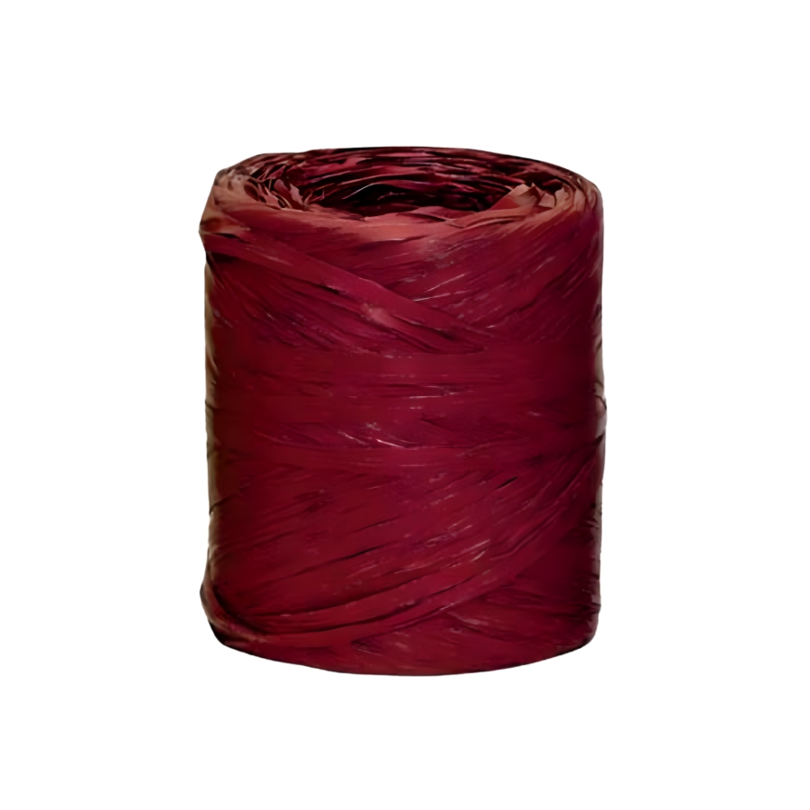 Bobina de cinta de rafia sintética de polipropileno en color burdeos, con 15 mm de ancho y 200 metros de longitud. Ideal para cierre de bolsas, decoración y múltiples usos. Disponible también en otros colores.