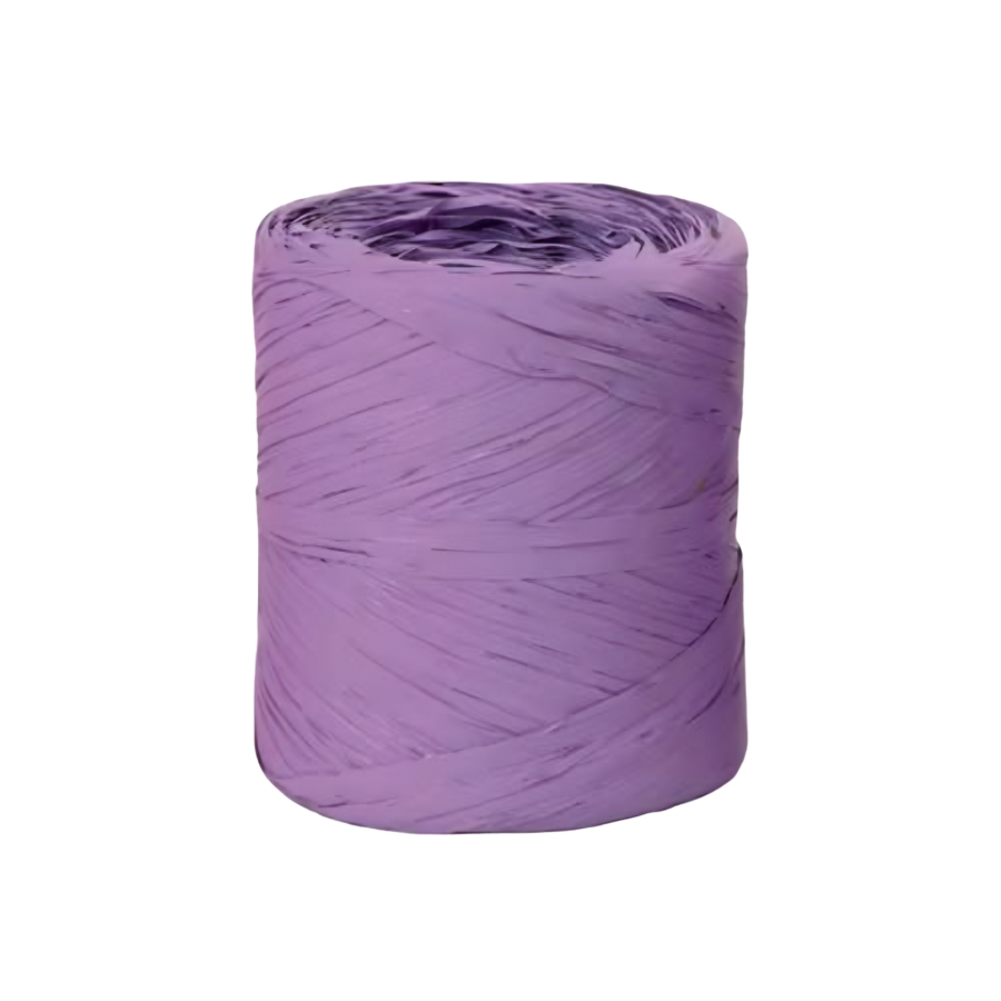 Bobina de cinta de rafia sintética de polipropileno en color lavanda, con 15 mm de ancho y 200 metros de longitud. Ideal para cierre de bolsas, decoración y múltiples usos. Disponible también en otros colores.