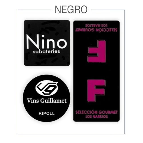 Etiqueta adhesiva en negro personalizable con diferentes formas y tintas. Ideal para negocios y eventos.