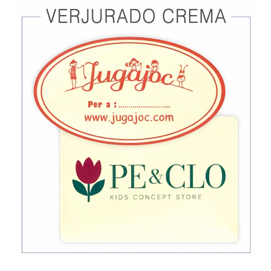 Etiqueta adhesiva en papel verjurado color crema, personalizable con diferentes formas y tintas. Ideal para negocios y eventos.